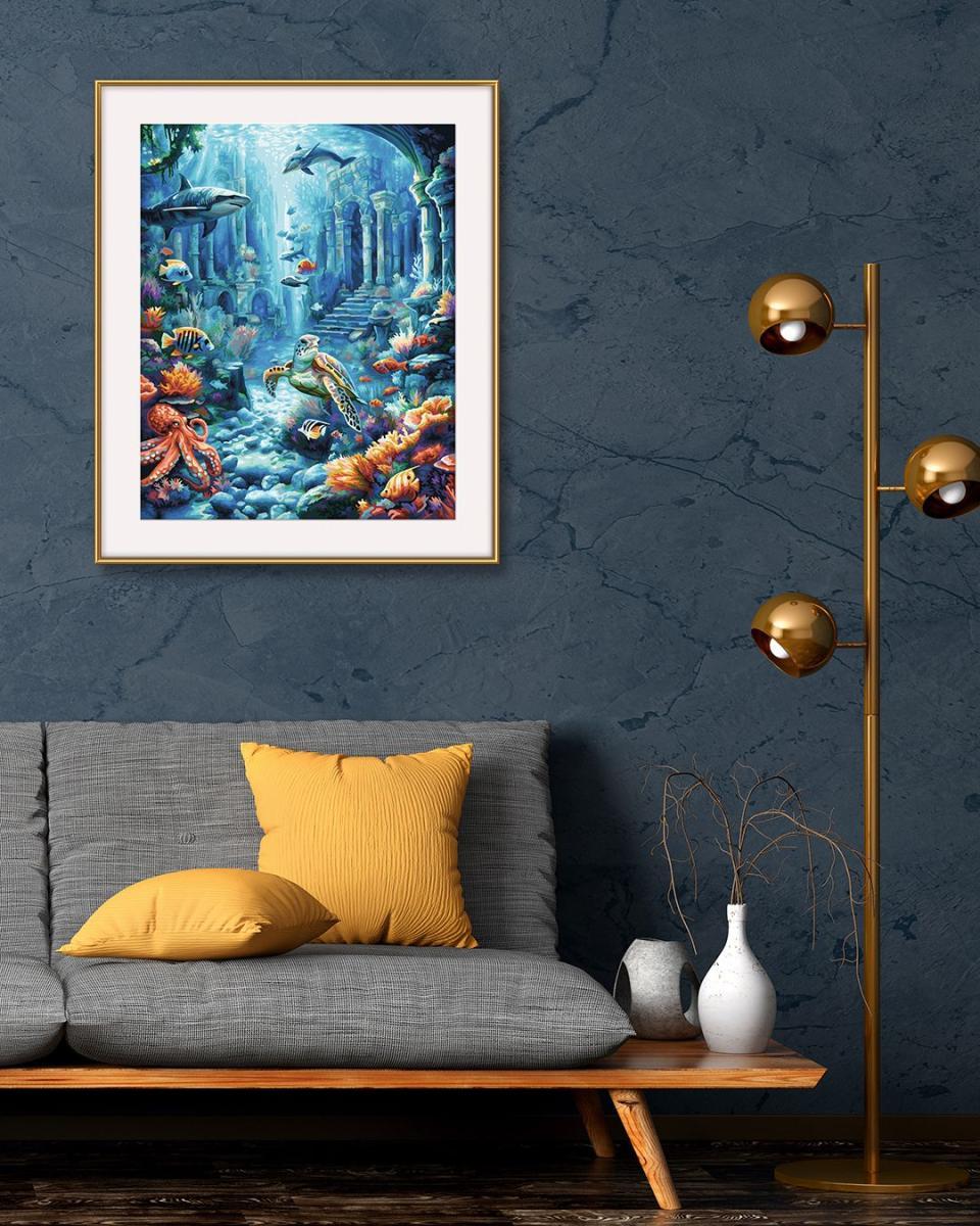 Eine Meeresschildkröte schwebt Durch das klare Wasser, umgeben von bunten Korallen und einem neugierigen Oktopus. Ein schimmerndes Blau taucht die Szene in eine magische Unterwasserwelt. Das 40 x 50 cm große Motiv mit 36 Acrylfarben fordert etwas mehr GeDuld – perfekt für Fortgeschrittene, die Freude an Details und feinen Nuancen haben.