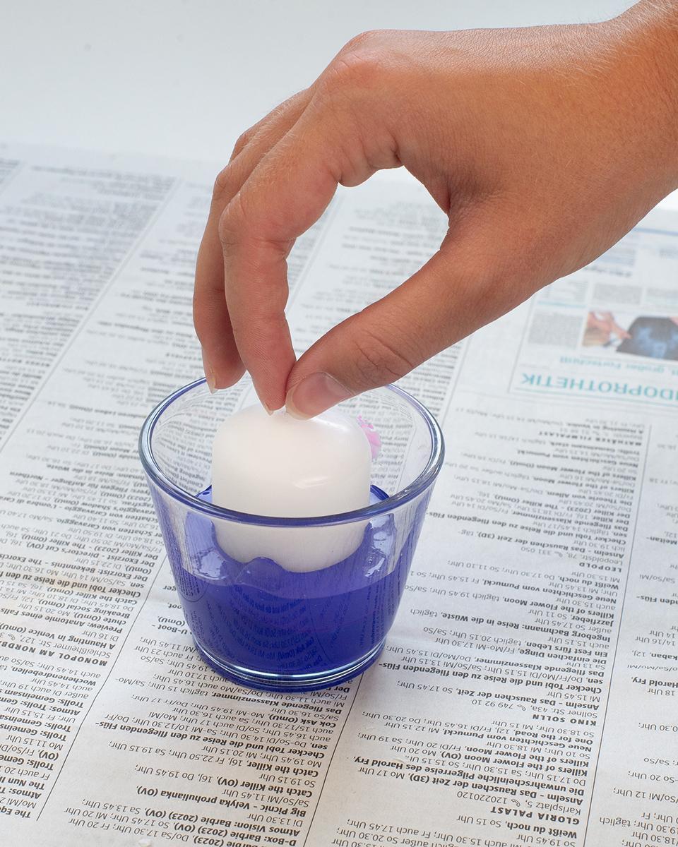 - Place the bowls on newspaper, hold the candle by the wick and dip it into the paint, bottom side first. The deeper you dip it, the more it will be dyed.