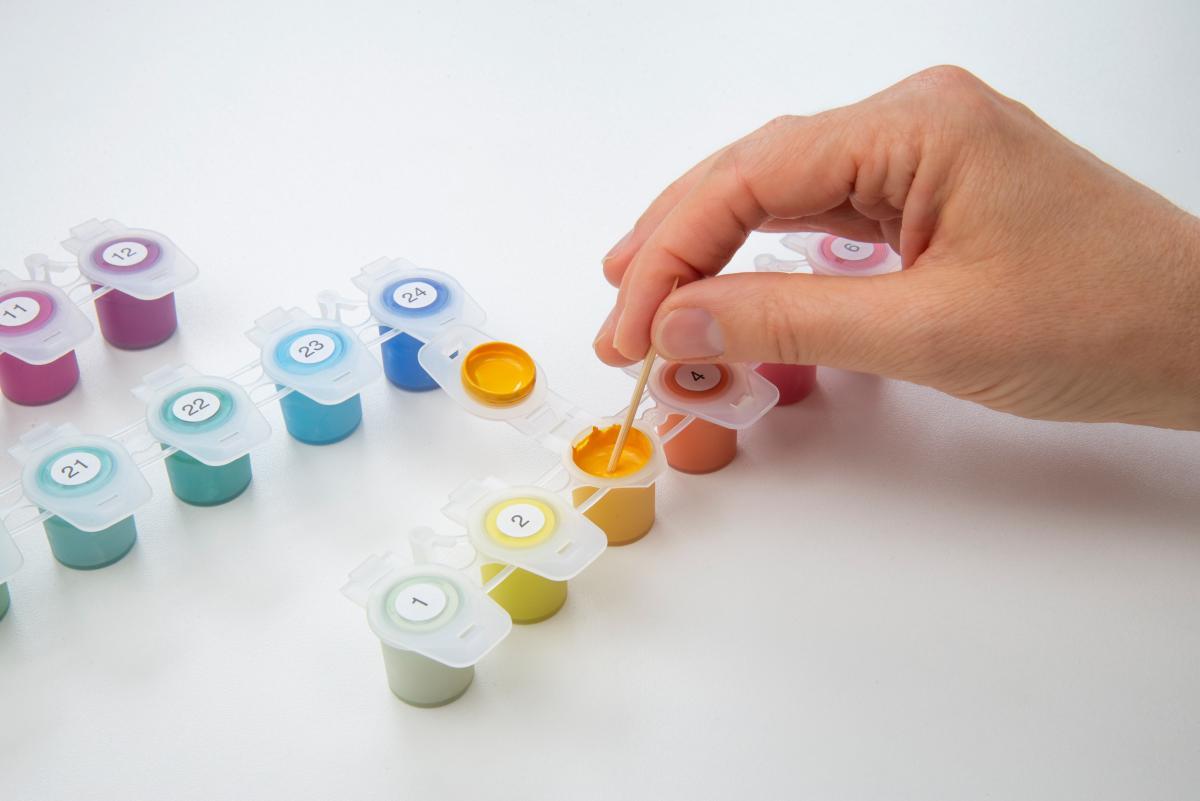Dès le début, il est préférable de placer les pots de peinture et les pinceaux de manière ordonnée et à portée de main. Tu peux par exemple ranger les couleurs dans l'ordre croissant ou décroissant des numéros ou encore en fonction de la luminosité de la nuance de couleur, afin de ne pas devoir chercher inutilement le bon pot par la suite.  ; Dans ce contexte, tiens compte de la numérotation des pots de peinture et consulte la description correspondante sur la feuille de contrôle. Celle-ci explique en détail le système de numérotation des pots de peinture. Il est important de noter que chaque set de peinture a sa propre numérotation spécifique (Si d'ailleurs les pots de peinture ont une fois le même numéro, ils doivent être considérés comme des couleurs de remplacement). Une attribution correcte des couleurs au modèle de coloriage est donc décisive pour éviter des écarts de couleur involontaires et obtenir un résultat de peinture optimal. Ainsi, tu gardes à tout moment une vue d'ensemble et tu peux t'assurer que ton œuvre d'art sera exactement comme tu l'as imaginée.