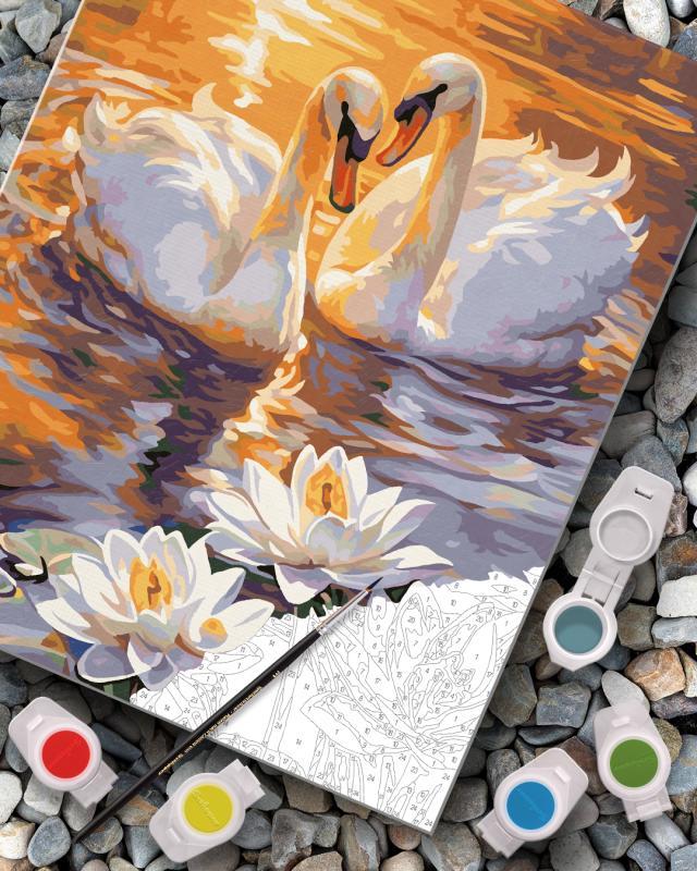 Un lac tranquille, une douce lumière du soir et deux cygnes glissant gracieusement dans l'eau. Ce motif est comme une petite lettre d'amour à la nature - idéal pour oublier le stress de la vie quotidienne en peignant. Avec son format pratique et ses zones de couleur gérables, il convient particulièrement aux débutants.
