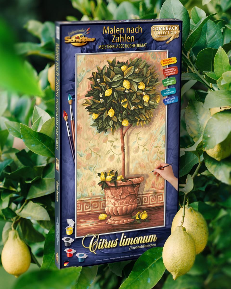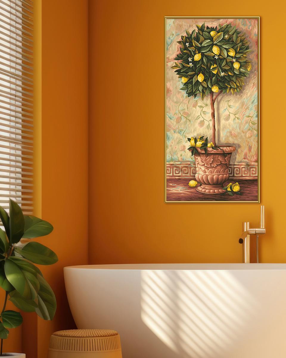 Un citronnier jaune vif sur un fond méditerranéen chaud - ce motif apporte l'été, le soleil et un sentiment de vacances directement dans le salon. Les nombreuses feuilles fines et les détails complexes en font un défi passionnant pour les peintres expérimentés qui aiment les projets détaillés.